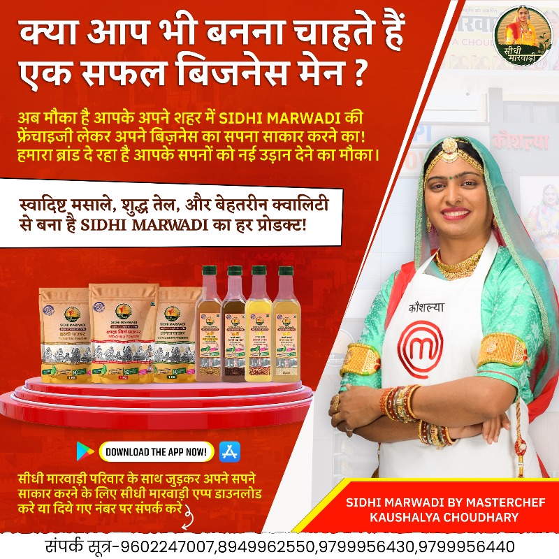 Sidhi Marwadi की फ्रेंचाइजी लेने का मतलब है एक ऐसे व्यवसाय का हिस्सा बनना, जो न केवल अपने बेहतरीन मसालों और शुद्ध तेलों के लिए जाना जाता है, बल्कि ग्राहकों के दिलों में एक खास जगह भी बना चुका है। इस ब्रांड से जुड़ना आपकी सफलता की राह को आसान बनाता है, क्योंकि यहां आप एक ऐसे नाम का हिस्सा बनते हैं, जो पहले से ही स्थापित और विश्वसनीय है। इस ब्रांड की खासियत इसकी गुणवत्ता है। Sidhi Marwadi के मसाले और तेल हमेशा शुद्ध और प्रामाणिक होते हैं, जो ग्राहकों को बार-बार आकर्षित करते हैं। जब आप हमारे साथ जुड़ते हैं, तो आपको उच्च गुणवत्ता वाले उत्पादों की नियमित आपूर्ति सुनिश्चित की जाती है। इसके साथ ही, ब्रांड की पहले से स्थापित मार्केटिंग रणनीतियाँ आपको बाजार में आसानी से जगह बनाने में मदद करती हैं। राष्ट्रीय और क्षेत्रीय स्तर पर हमारी ब्रांडिंग से आपका व्यवसाय तेजी से आगे बढ़ता है, और आप स्थानीय स्तर पर ग्राहकों का विश्वास आसानी से जीत सकते हैं। Sidhi Marwadi की फ्रेंचाइजी लेने का एक और बड़ा फायदा यह है कि हमारी वेबसाइट और ऐप पर आने वाले सभी ऑर्डर आपकी फ्रेंचाइजी के माध्यम से भेजे जाते हैं तो सामान Online बिके या offline बिके Profit तो आपको ही मिलना है। इससे न केवल आपकी फ्रेंचाइजी की बिक्री बढ़ती है, बल्कि ग्राहकों को उनके ऑर्डर भी जल्दी मिल जाते हैं। अतः अगर आप अपने शहर में एक सफल व्यवसाय खड़ा करने का सपना देखते हैं, और आप 12 से 15 लाख रुपये इन्वेस्ट कर सकते हैं तो Sidhi Marwadi की फ्रेंचाइजी लेना आपके लिए एक सही कदम है। यह सिर्फ एक व्यवसाय नहीं, बल्कि आपके भविष्य को सुरक्षित और समृद्ध बनाने का अवसर है। तो अब बिना देर किये अपने फ़ोन में Sidhi Marwadi App Download करें और Franchisee के लिये Registration करें! ज्यादा जानकारी के लिये अभी हमारी Team से सम्पर्क करें! 9799956430, 9799956440, 9602247007, 8949962550