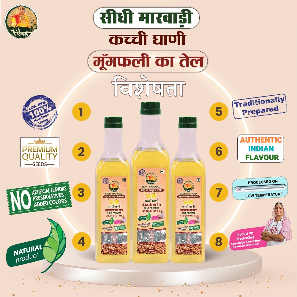 सीधी मारवाड़ी कच्ची घाणी मूंगफली के तेल के साथ अपनी पाक यात्रा को उन्नत करें जहां प्रकृति, परंपरा और संस्कृति एकजुट होकर आपको एक अनोखा स्वादिष्ट अनुभव देती है।