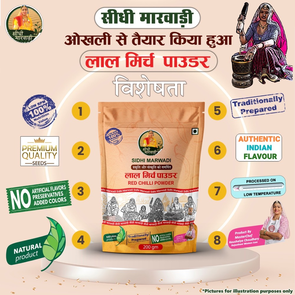 सीधी मारवाड़ी लाल मिर्च पाउडर के साथ अपने व्यंजनों की स्वादिष्ट यात्रा शुरू करें, जो प्रकृति के स्पर्श और सांस्कृतिक समृद्धि का एक उत्कृष्ट मिश्रण है। किसानों से सीधे प्राप्त, हमारा 100% प्राकृतिक उत्पाद गुणवत्ता, प्रामाणिकता और पारंपरिक मूल्यों के प्रति हमारी प्रतिबद्धता का प्रमाण है। देखभाल और विशेषज्ञता के साथ तैयार किया गया, हमारा प्रीमियम लाल मिर्च पाउडर आपके व्यंजनों में एक अनोखा और प्रामाणिक भारतीय स्वाद प्रदान करता है! मास्टर शेफ कौशल्या चौधरी की विशेषज्ञता के साथ हमारा उत्पाद भारतीय व्यंजनों की गुणवत्ता, परंपरा और जीवंत स्वाद का प्रमाण है।प्रमुख विशेषता :