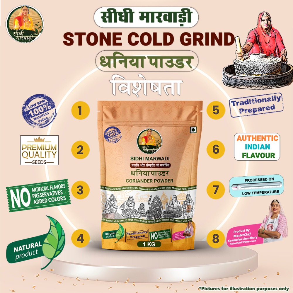 - Stone-ground spices: haldi, lal mirch, dhaniya and more